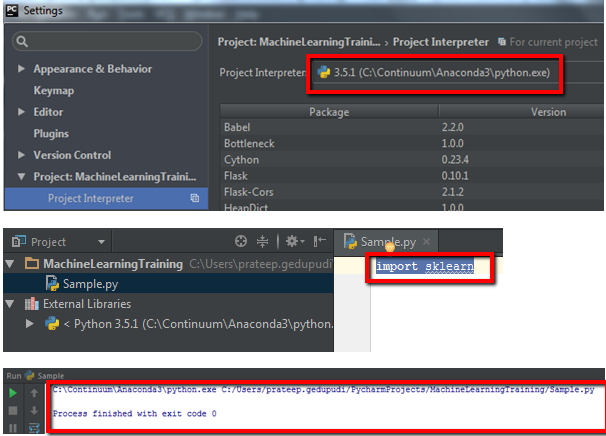 Python, NumPy, SciPy, scikit-learnand many more for us. Choose specific installation directory before installing.Ex: C:\Continuum\Anaconda3 OptionalDownload and install the pycharm IDE for python https://www.jetbrains.com/pycharm/download/#section=windows- Open pycharm IDE and set python interpreter as our Anaconda3 directory.